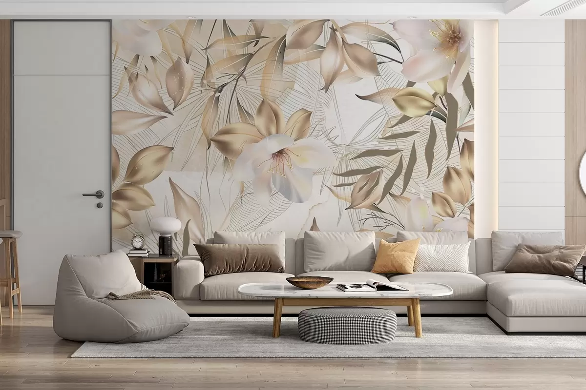 Stenske poslikave Cvetovi in listi jasmina, mehke barve, botanična ilustracija, cvetlično ozadje , elegantno oblikovanje, občutljivi cvetni lističi Št. w08977
