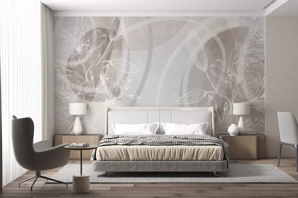 Stenske poslikave Minimalistična cvetlična zasnova z belimi cvetovi in listi, prekrivajočimi se abstraktnimi krogi v bež in modrih odtenkih Št. w08979v1