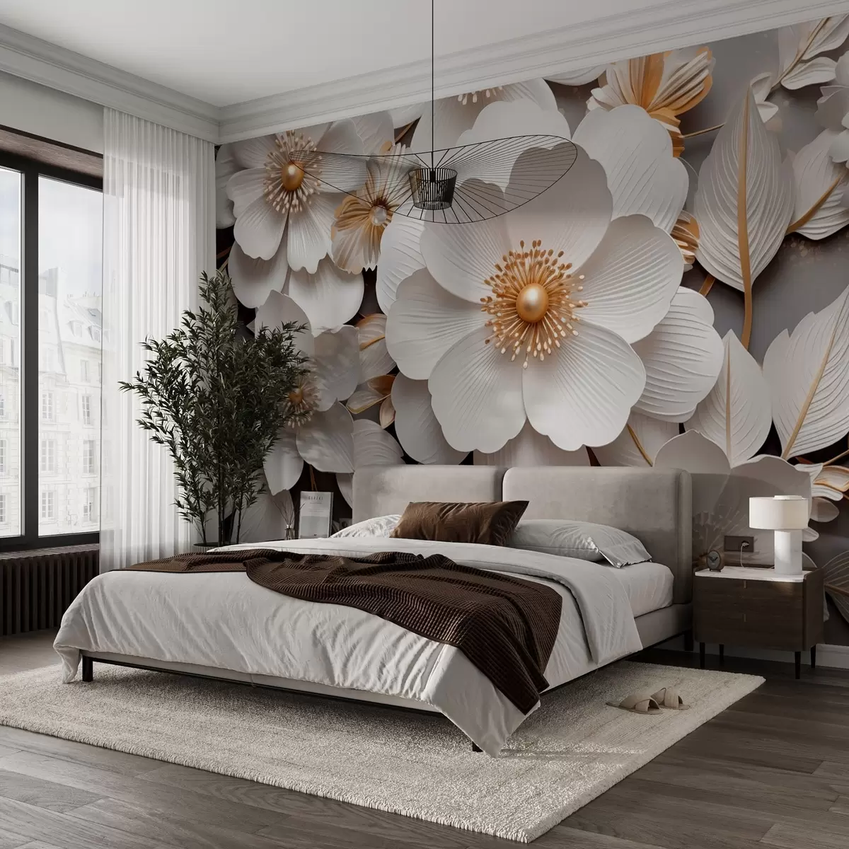 Stenske poslikave 3D cvetje v slogu origami v rumeno-sivih tonih Št. w08993