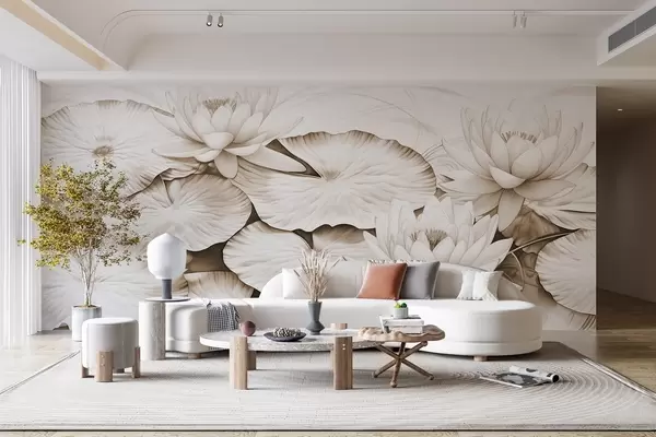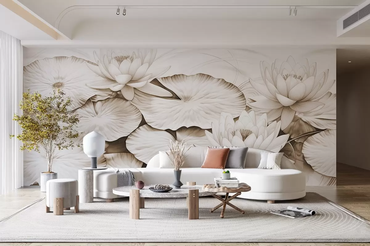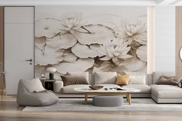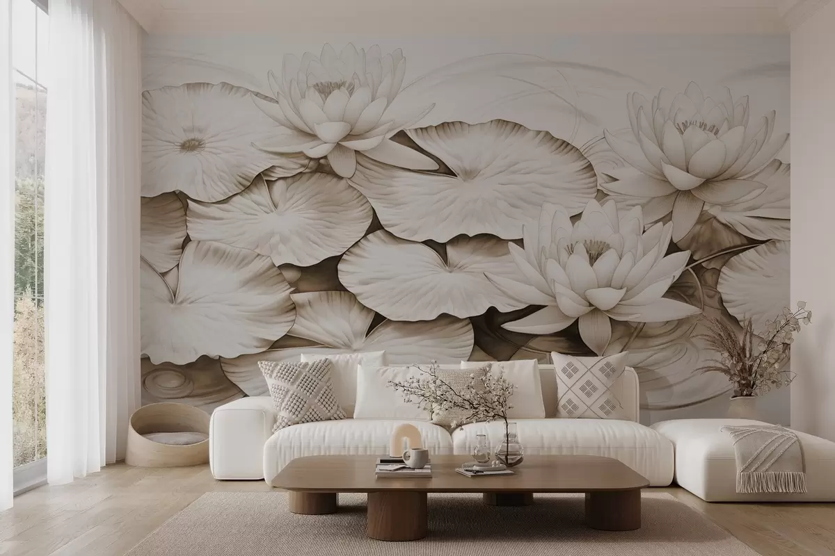 Stenske poslikave Vodne lilije in lilije v ribniku, rjava in bela imitacija risbe s svinčnikom, podrobna botanična ilustracija, umetnost narave Št. w09006v2