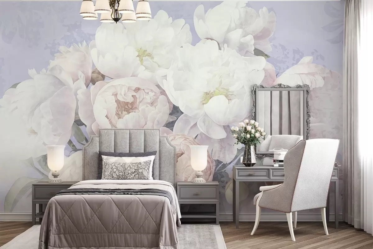 Stenske poslikave Teksturirane abstraktne breskve in bele borovnice z zelenimi listi, svetlo ozadje, mehke in nežne barve, vintage slog Št. w09008v1