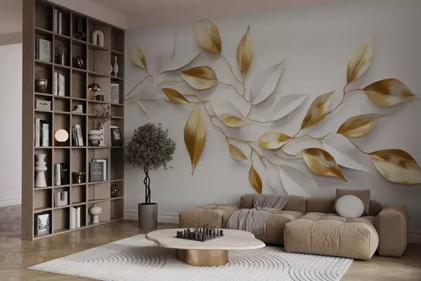 Stenske poslikave Rumeni in beli listi na veji , elegantno oblikovanje, belo ozadje, minimalistični slog, dekorativna umetnost , navdihnjeno z naravo Št. w09015