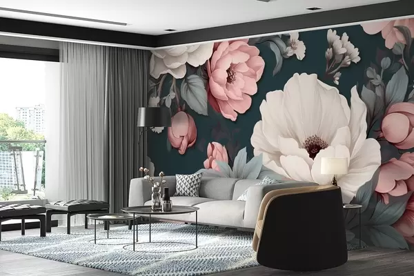 Stenske poslikave Bele in rožnate pivonje na temno modrem ozadju Št. w09017