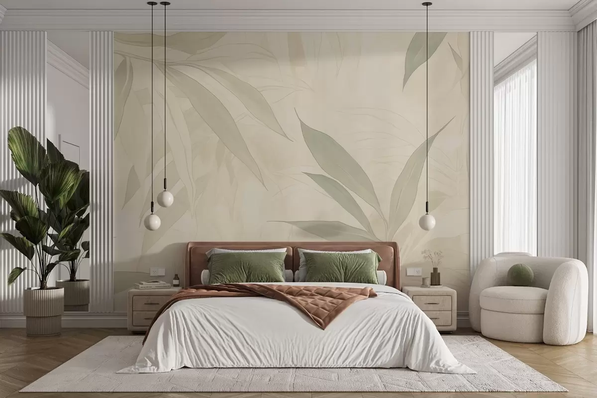 Stenske poslikave Veje z listi v mehkih zelenih tonih na bež ozadju Št. w09027