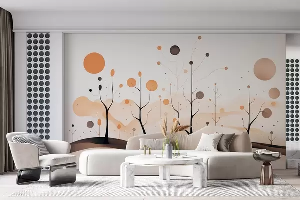 Stenske poslikave Abstraktna drevesa s kroglami in soncem v bež-sivih tonih Št. w09043