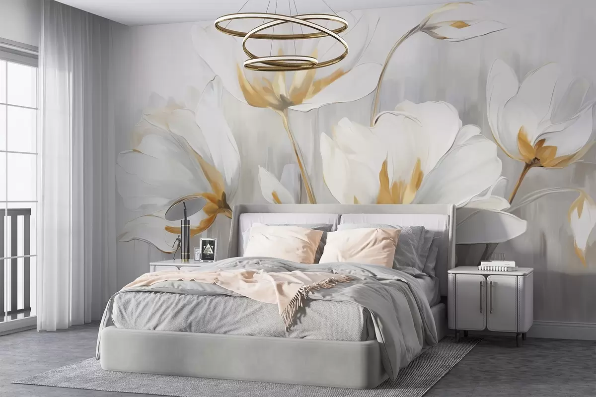 Stenske poslikave Bele abstraktne rože z belimi cvetnimi listi in stebli na sivem ozadju s sivimi in belimi navpičnimi potezami čopiča Št. w09047