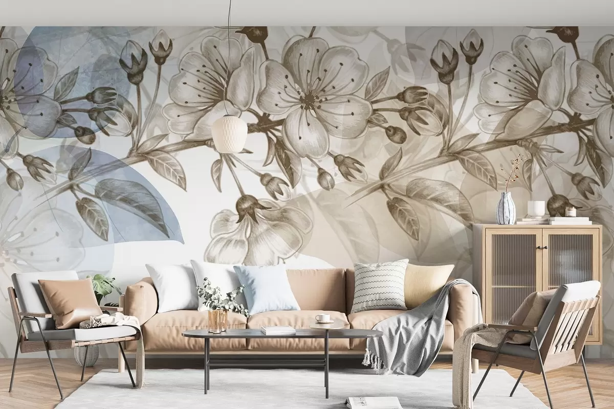 Stenske poslikave Veja češnjevega cveta s cvetovi in popki, odtenki sepije, mehko akvarelno ozadje z modrimi in rjavimi odtenki Št. w09051