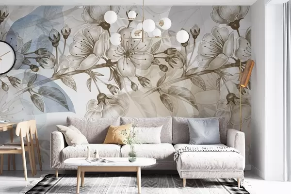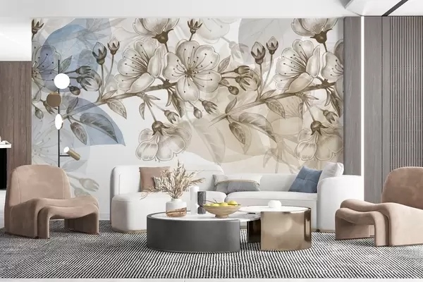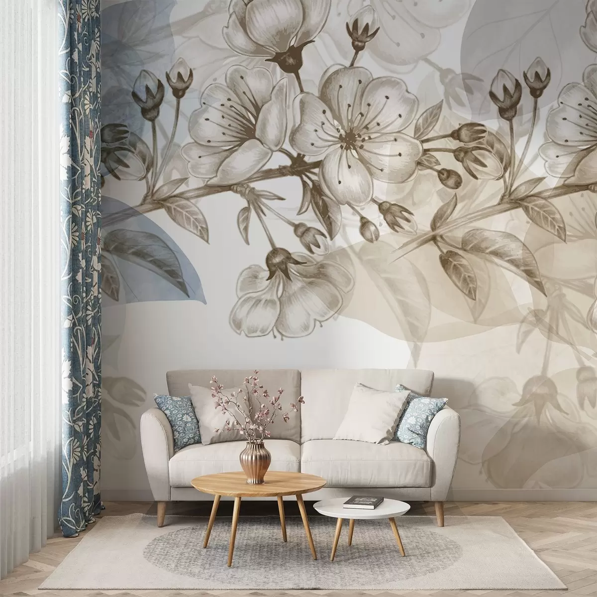 Stenske poslikave Veja češnjevega cveta s cvetovi in popki, odtenki sepije, mehko akvarelno ozadje z modrimi in rjavimi odtenki Št. w09051