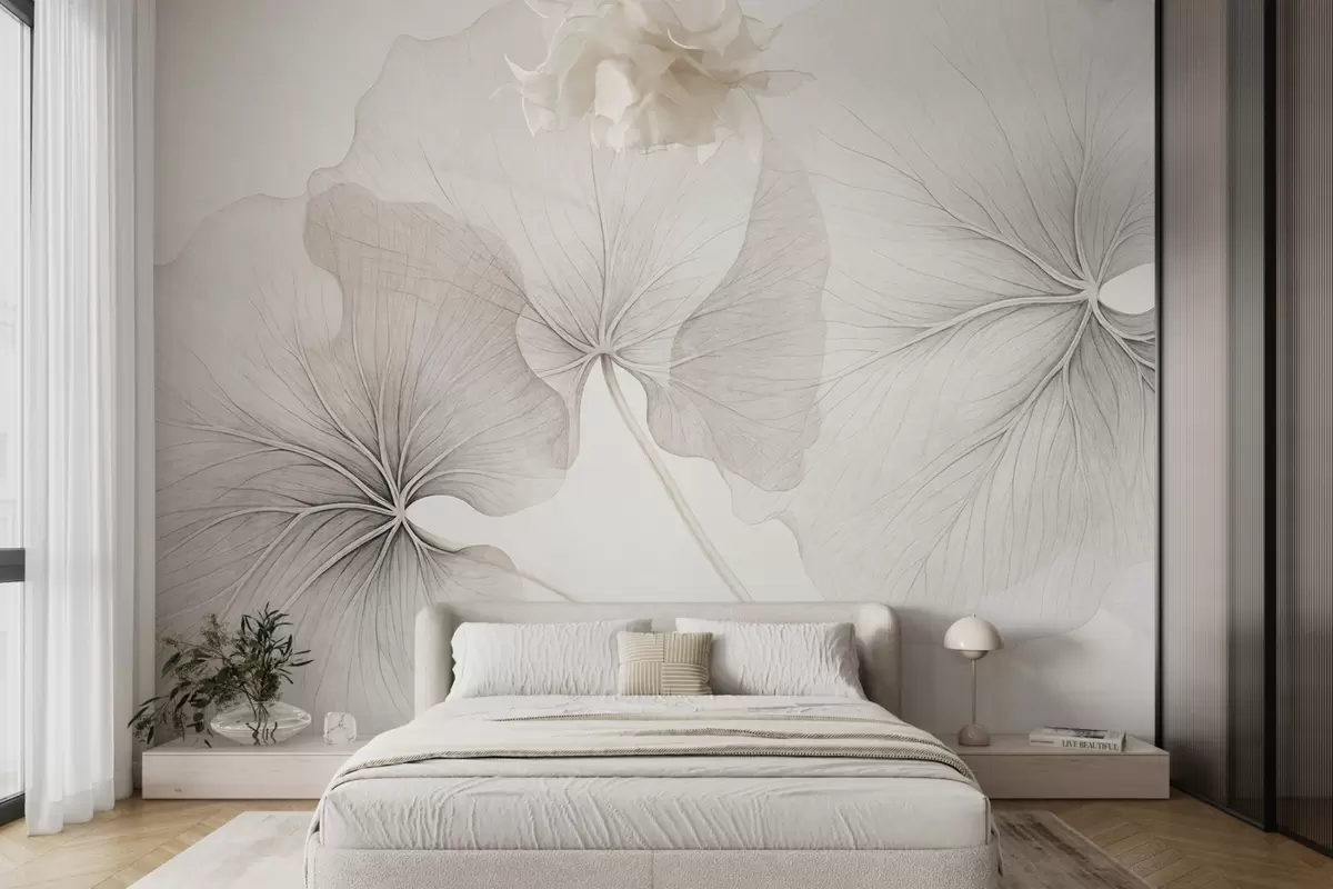 Stenske poslikave Trije prosojni listi z vidnimi žilami, z rahlo prekrivajočo se teksturo hrupa, s tankimi stebli na beli podlagi Št. w09052