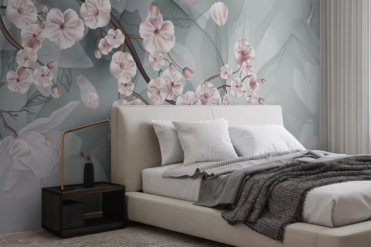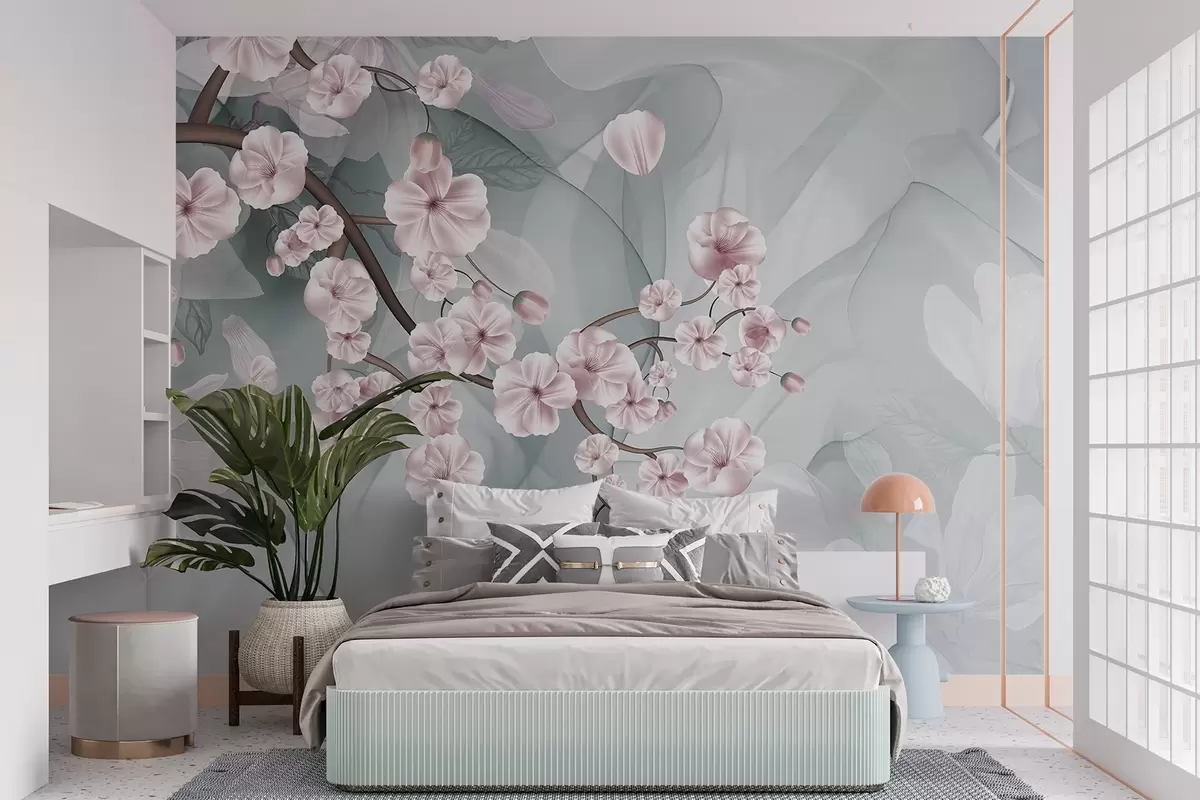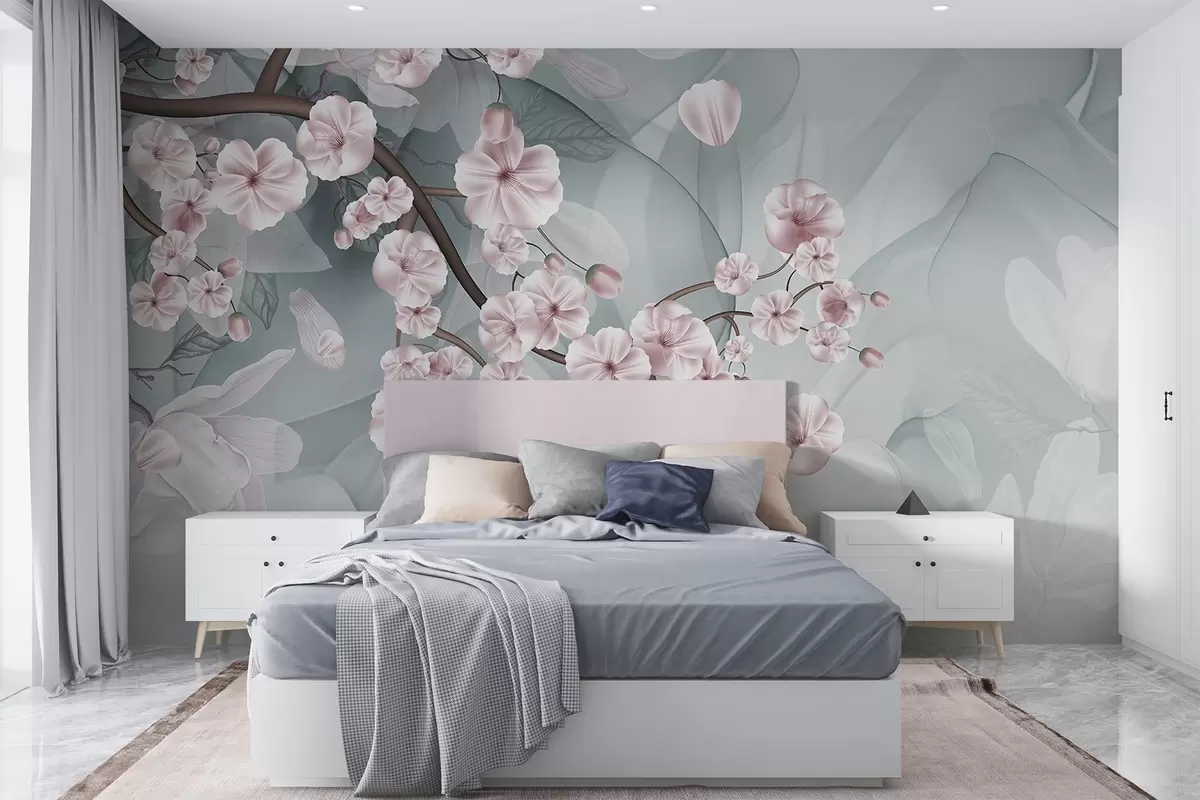 Stenske poslikave Veje češnjevih cvetov z rožnatimi cvetovi in cvetnimi listi, rjave veje, abstraktno utišano ozadje s tekočim učinkom Št. w09054