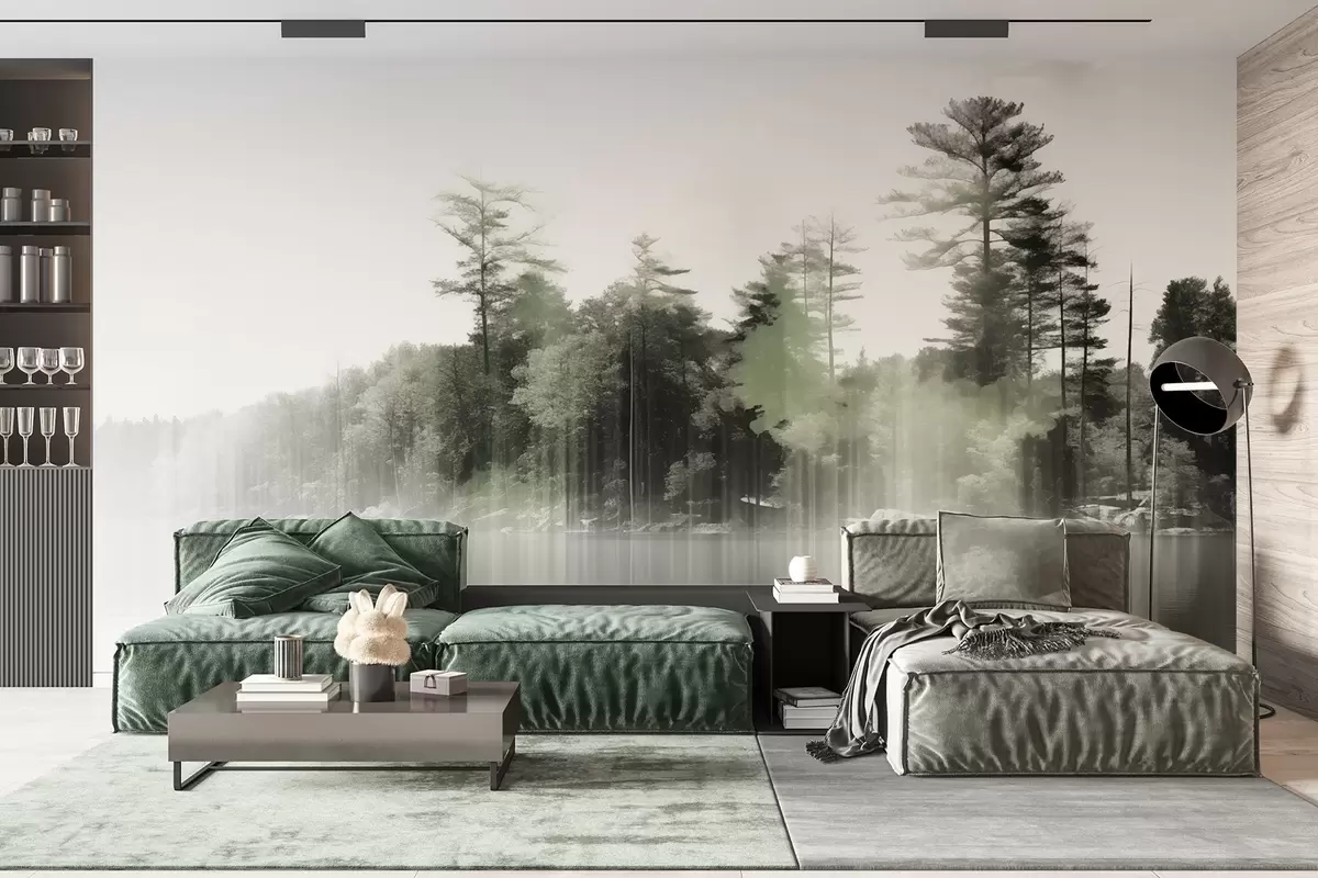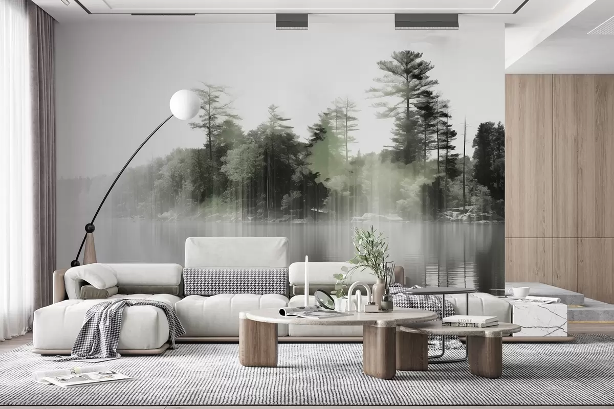 Stenske poslikave Abstraktni minimalizem teksturirana pokrajina z jezerom in odsevi dreves v vodi v zelenih in belih odtenkih Št. w09058