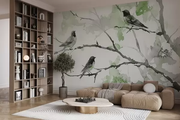Stenske poslikave Ptice na drevesnih vejah v akvarelnem slogu Št. w09064v3