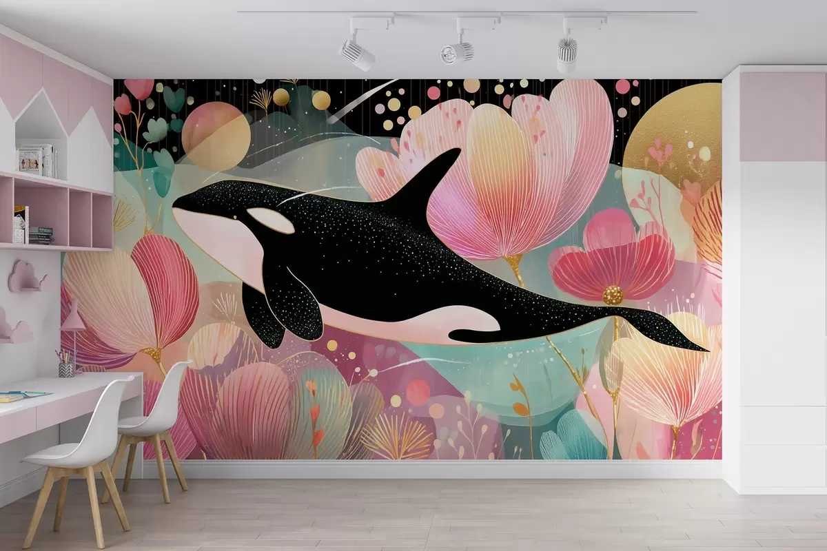 Stenske poslikave Plavajoča črna orka na ozadju rožnatih cvetov Št. w09074