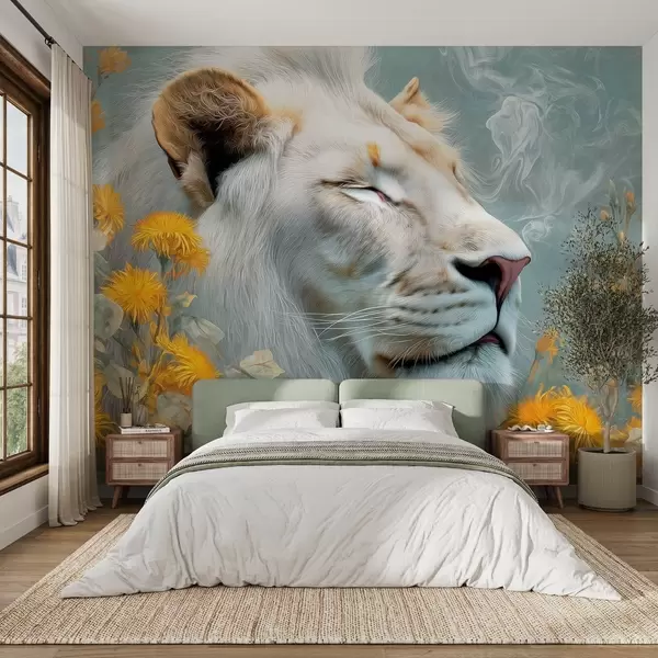 Stenske poslikave Beli lev, obdan z rumenimi cvetovi in dimom Št. w09080