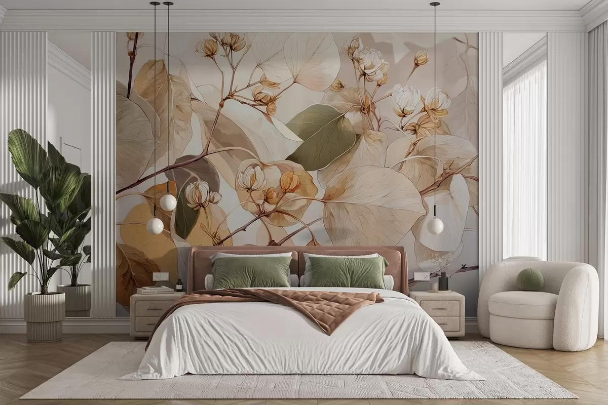 Stenske poslikave Veje osikovih listov in cvetov v slogu oljnega slikarstva v bež tonih Št. w09082