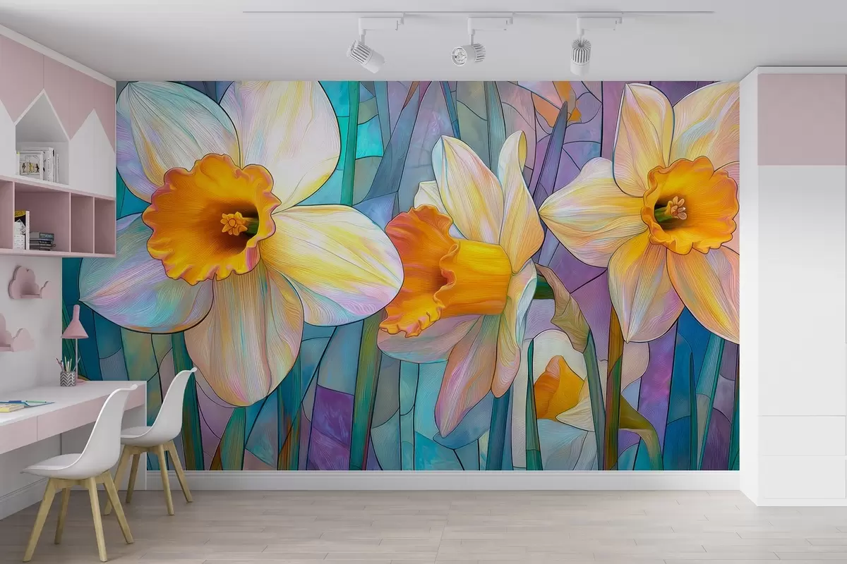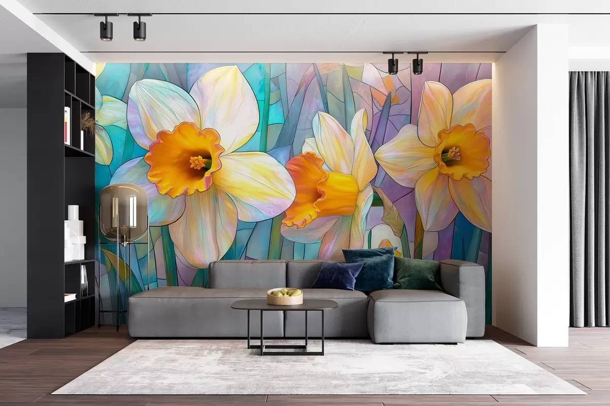 Stenske poslikave Pisane narcise na modro-vijoličnem vitražnem ozadju Št. w09092