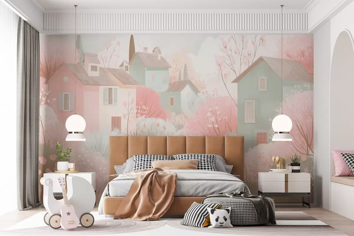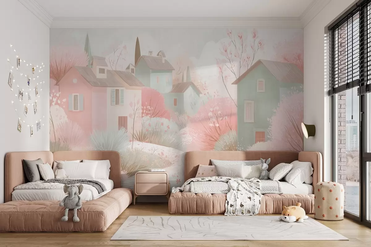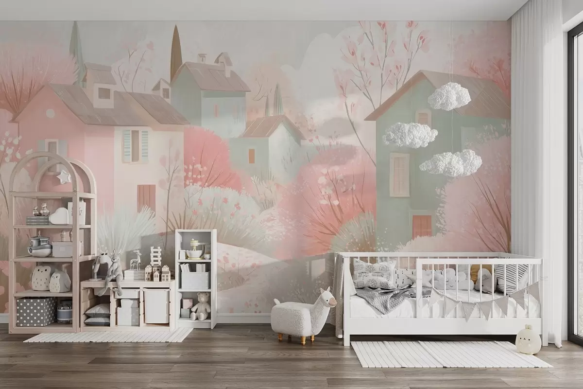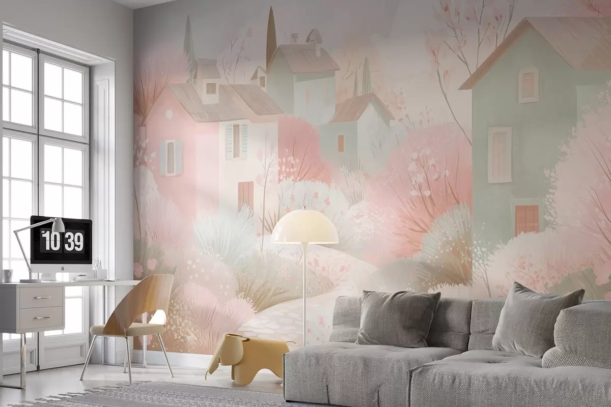 Stenske poslikave Pravljično mesto v slogu oljne slike v rožnatih odtenkih Št. w09095