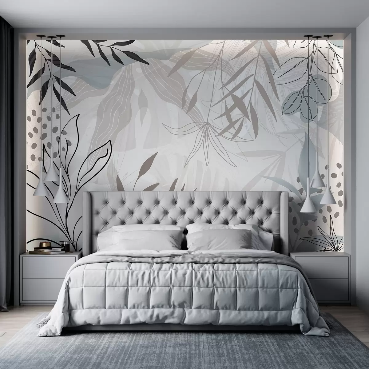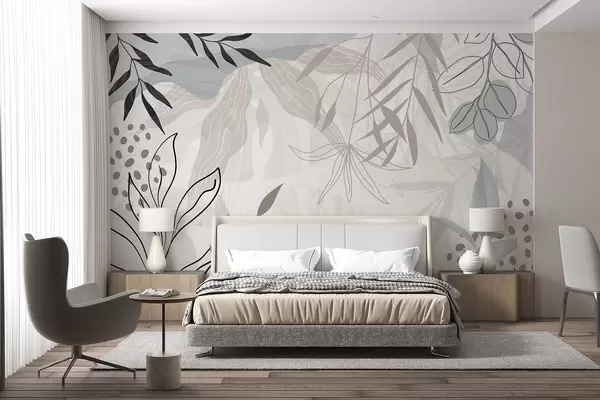 Stenske poslikave Abstraktna cvetlična sodobna zasnova s pastelnimi bež, sivimi, modrimi in črnimi listi, občutljivimi črtami in mehkim ozadjem Št. w09105