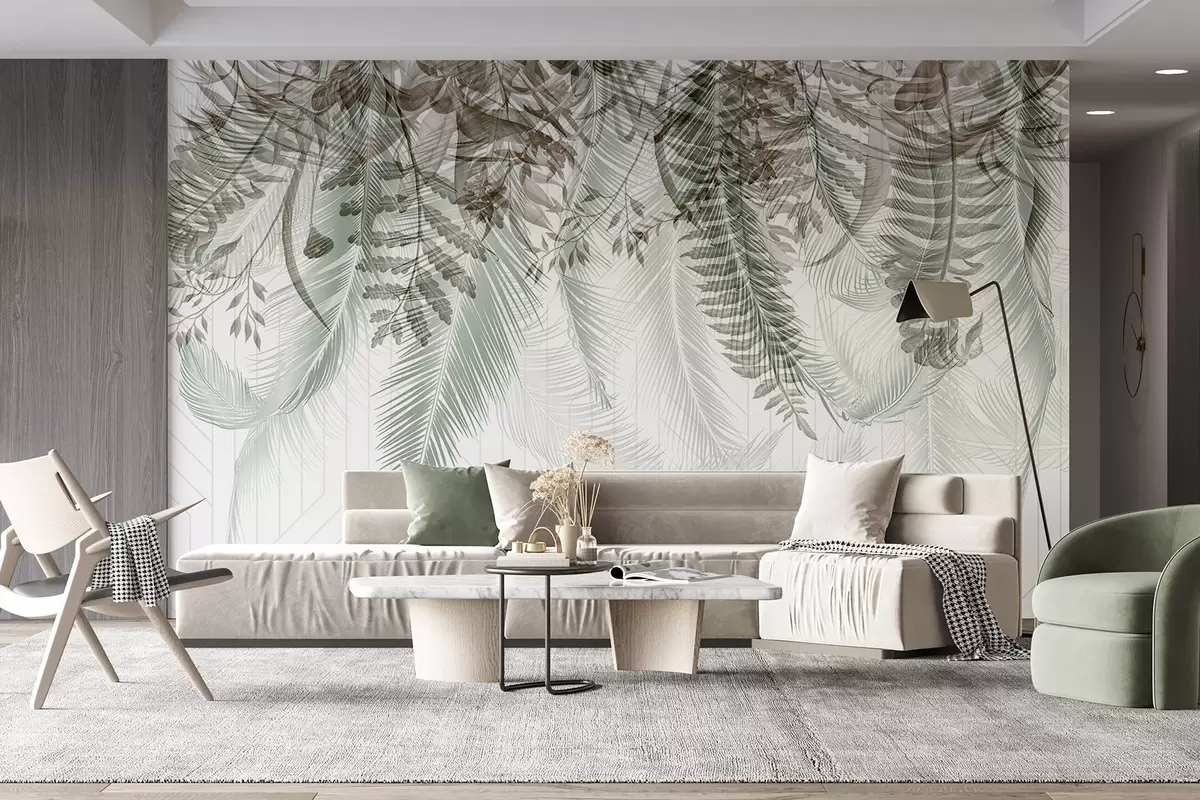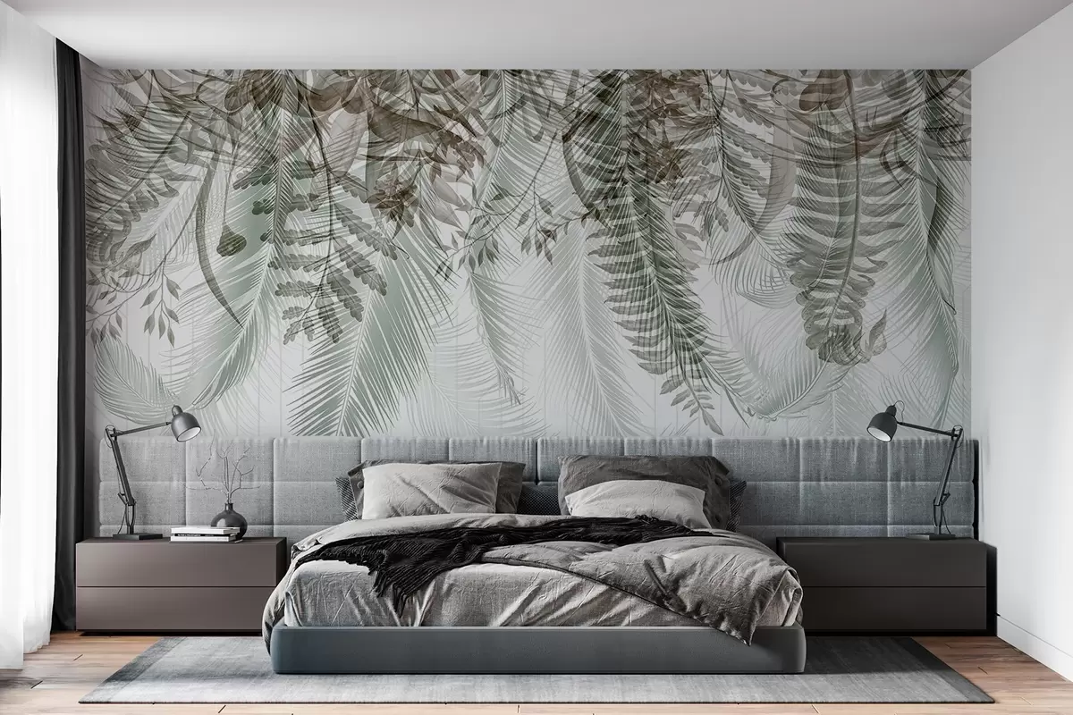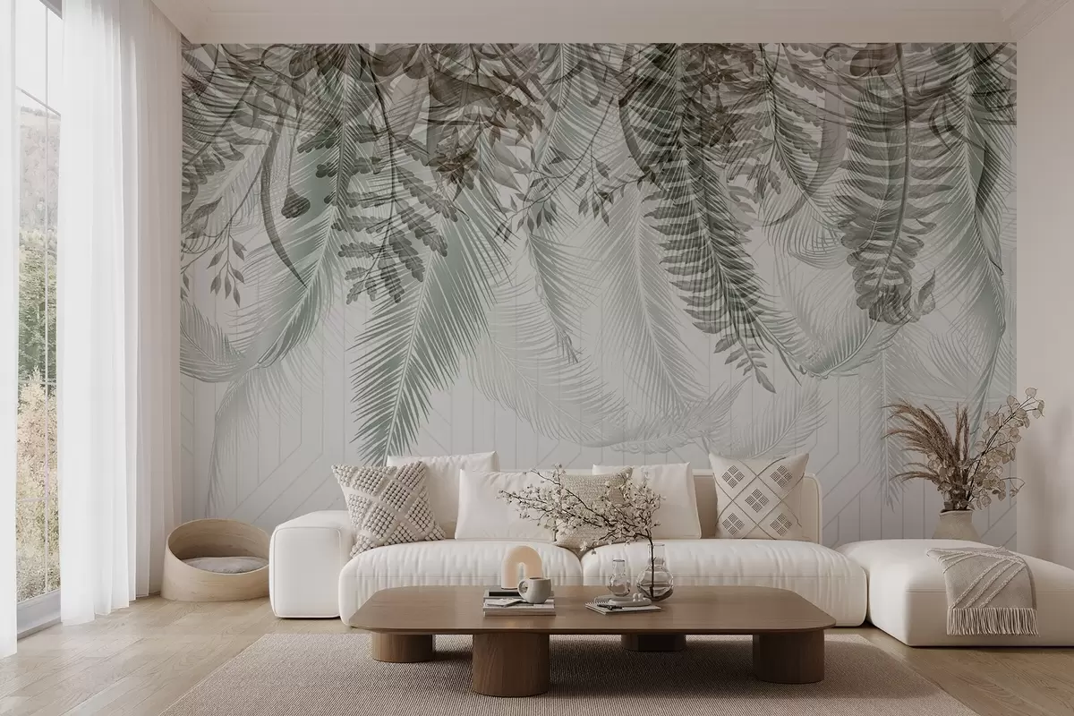 Stenske poslikave Nežno padajoče tropsko praproti in palmove liste, geometrijsko ozadje, mehka svetloba, umirjene barve, elegantno Št. w09106v1