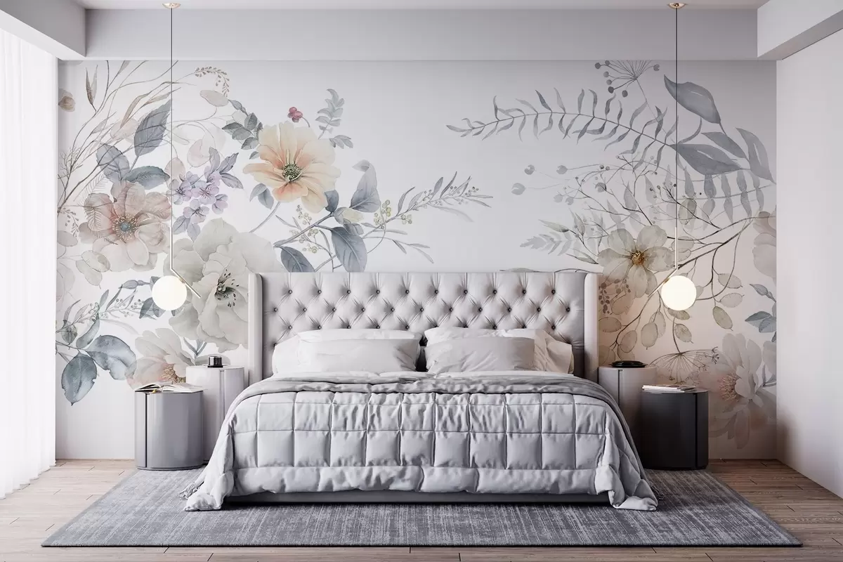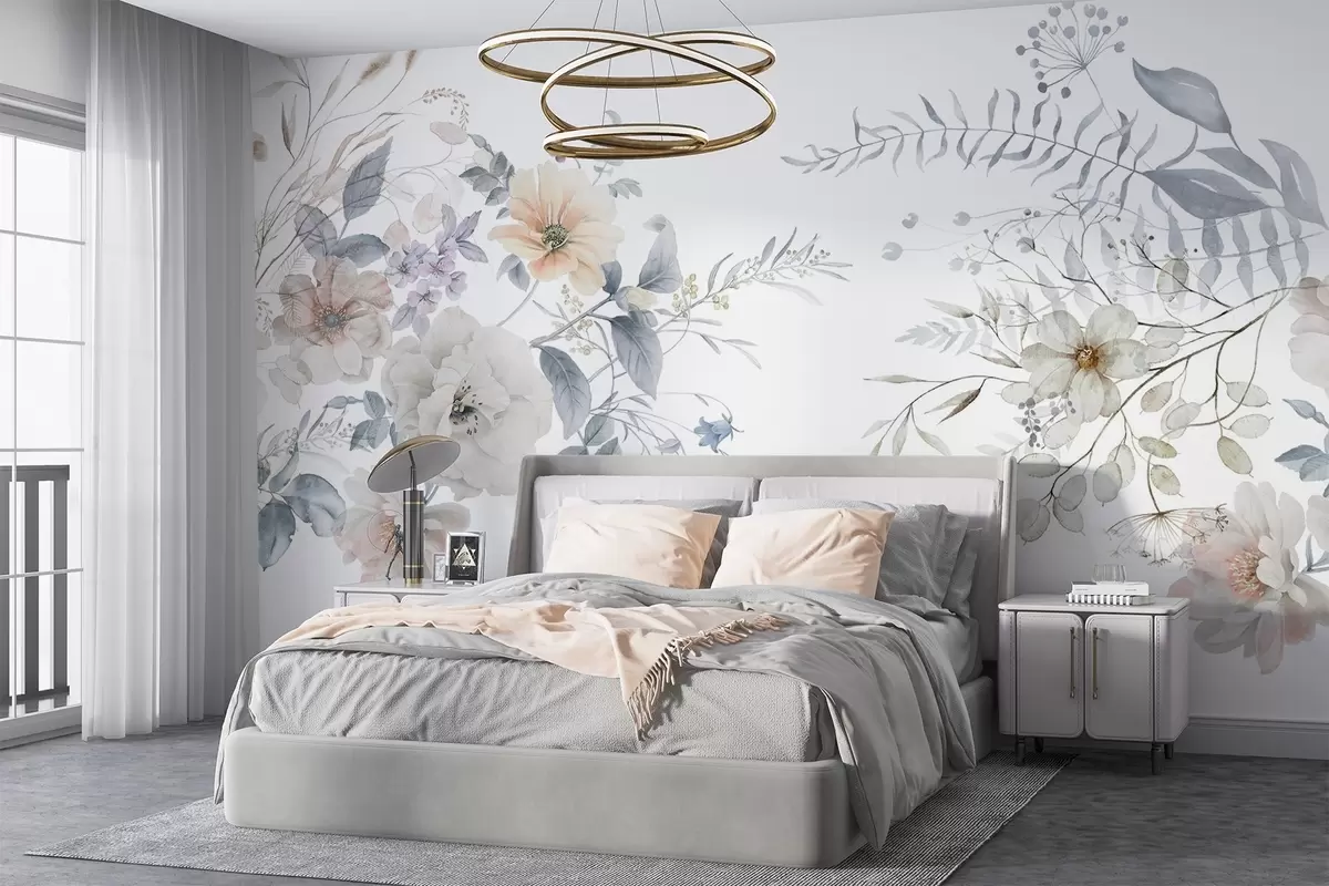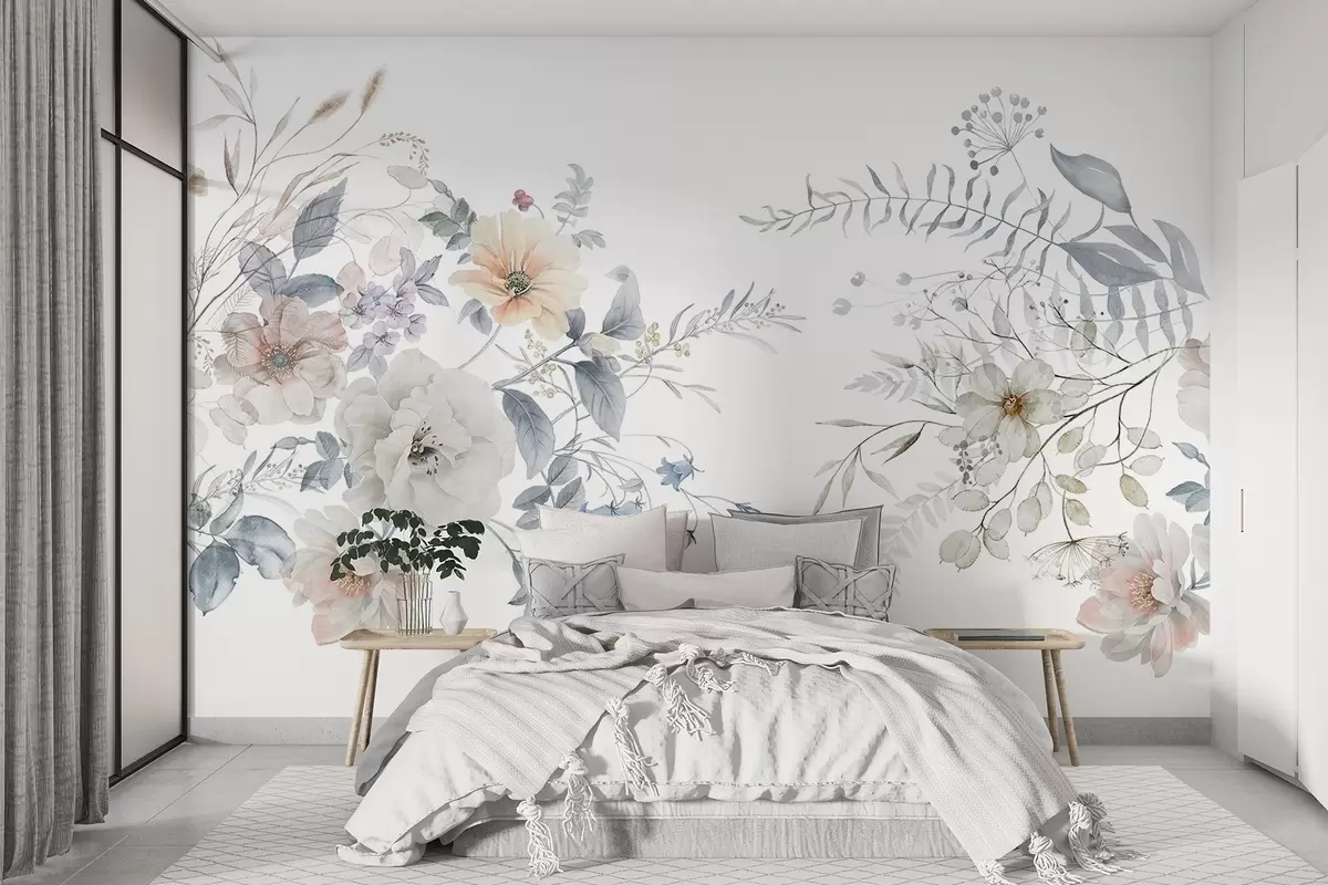 Stenske poslikave Cvetlični aranžma v slogu akvarelnega slikarstva z belim, breskovim in modrim cvetjem, občutljivim zelenjem na belem ozadju Št. w09108