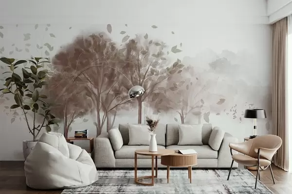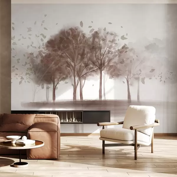 Stenske poslikave Abstraktna pokrajina z drevesi z rjavimi listi, ki se zrcalijo v vodi, v akvarelnem teksturiranem slogu Št. w09109v1