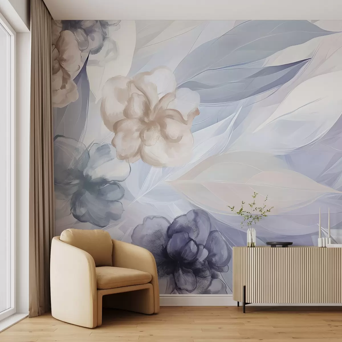 Stenske poslikave Nežno cvetje in listi v odtenkih bele, modre, vijolične in bež barve cvetlično ozadje , mehke barve, nežni cvetni lističi Št. w09111