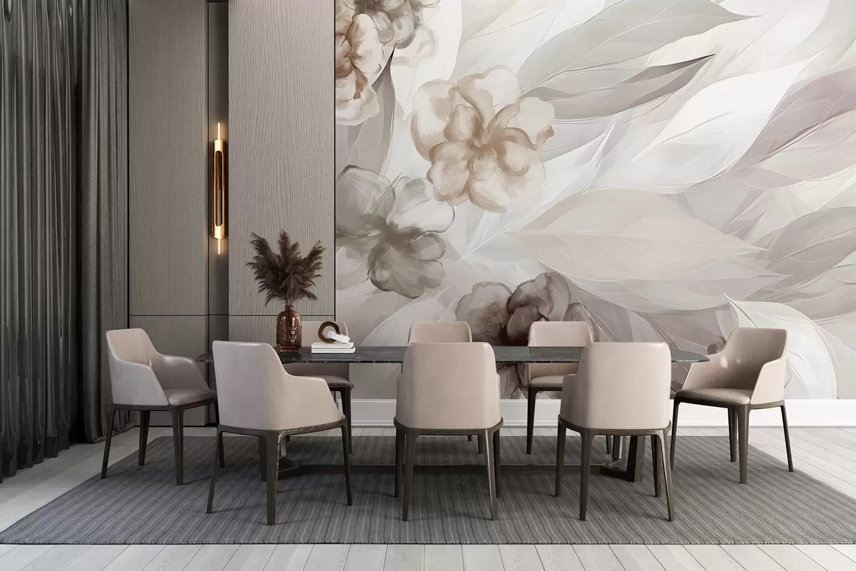 Stenske poslikave Nežno cvetje in listi v odtenkih bele, rjave in bež barve cvetlično ozadje , nežne barve, nežni cvetni lističi Št. w09111v1