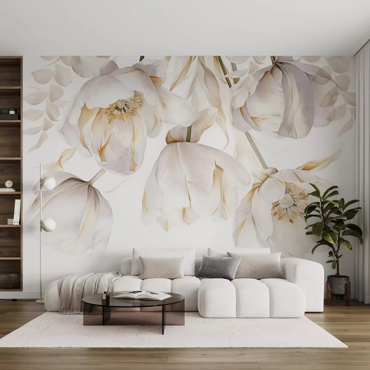 Stenske poslikave Beli tulipani z rumenimi pestiči, nežni cvetni lističi, eleganten cvetlični aranžma, nežna kompozicija, na belem ozadju Št. w09112