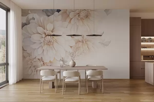 Stenske poslikave Pastelne dalije z mehkimi, občutljivimi breskovimi in belimi cvetnimi listi v akvarelnem slogu, mehko ozadje Št. w09115
