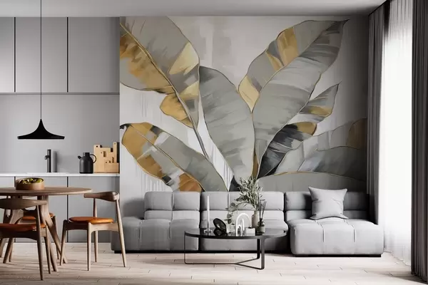 Stenske poslikave Banana tropski teksturirani listi s sivimi in rumenimi toni, sodoben slog, nevtralno ozadje, dekorativna slika Št. w09118