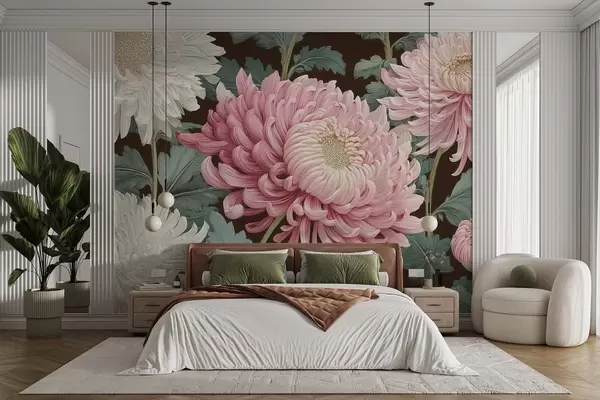 Stenske poslikave Roza in bele velike orhideje z listi na temnem ozadju Št. w09125