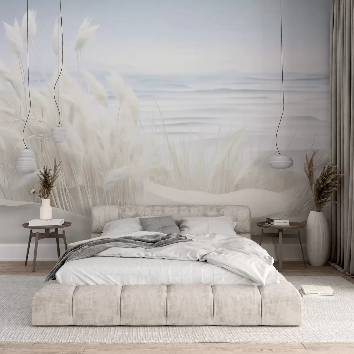 Stenske poslikave Pokrajina z belo pampasovo travo na peščeni sipini, s svetlo modrim oceanom v ozadju, v mehkem, minimalističnem slogu Št. w09132