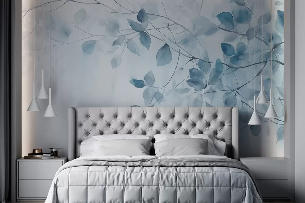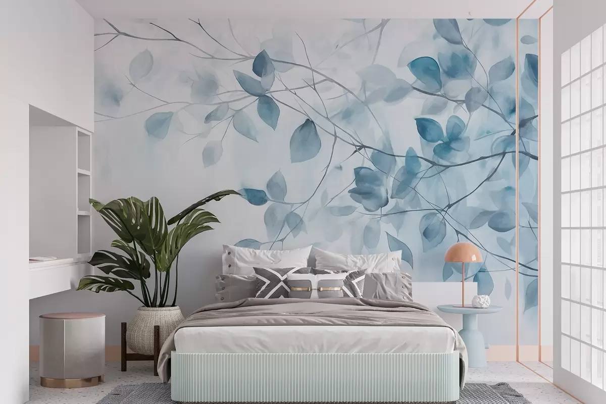 Stenske poslikave Teksturalno akvarelno slikarstvo, imitacija modrih listov in vej, mehke barve, občutljive podrobnosti na belem ozadju Št. w09133v1