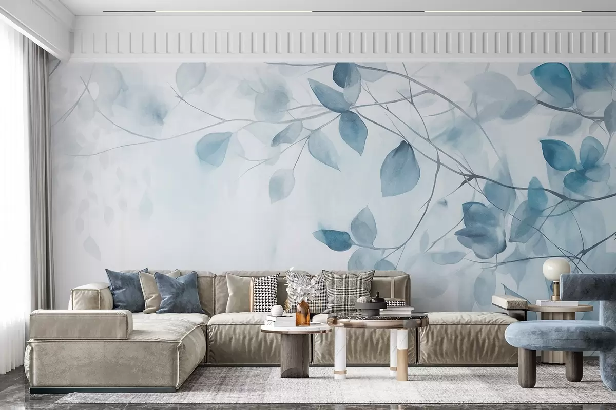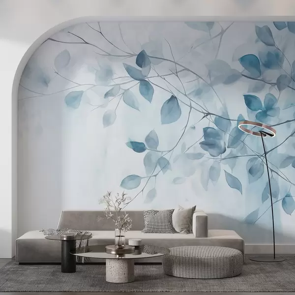 Stenske poslikave Teksturalno akvarelno slikarstvo, imitacija modrih listov in vej, mehke barve, občutljive podrobnosti na belem ozadju Št. w09133v1