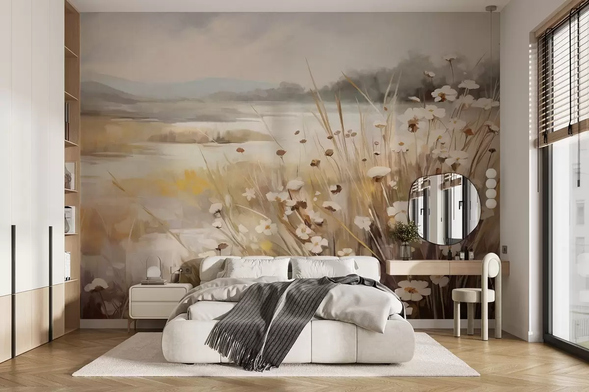 Stenske poslikave Polje visoke trave in belih marjetic, drevesa v ozadju, pod oblačnim nebom, teksturirana pokrajina, mehke poteze čopiča Št. w09139