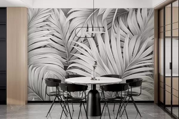 Stenske poslikave Enobarvni teksturirani tropski palmovi listi, ki ustvarjajo tropski in botanični tisk Št. w09145