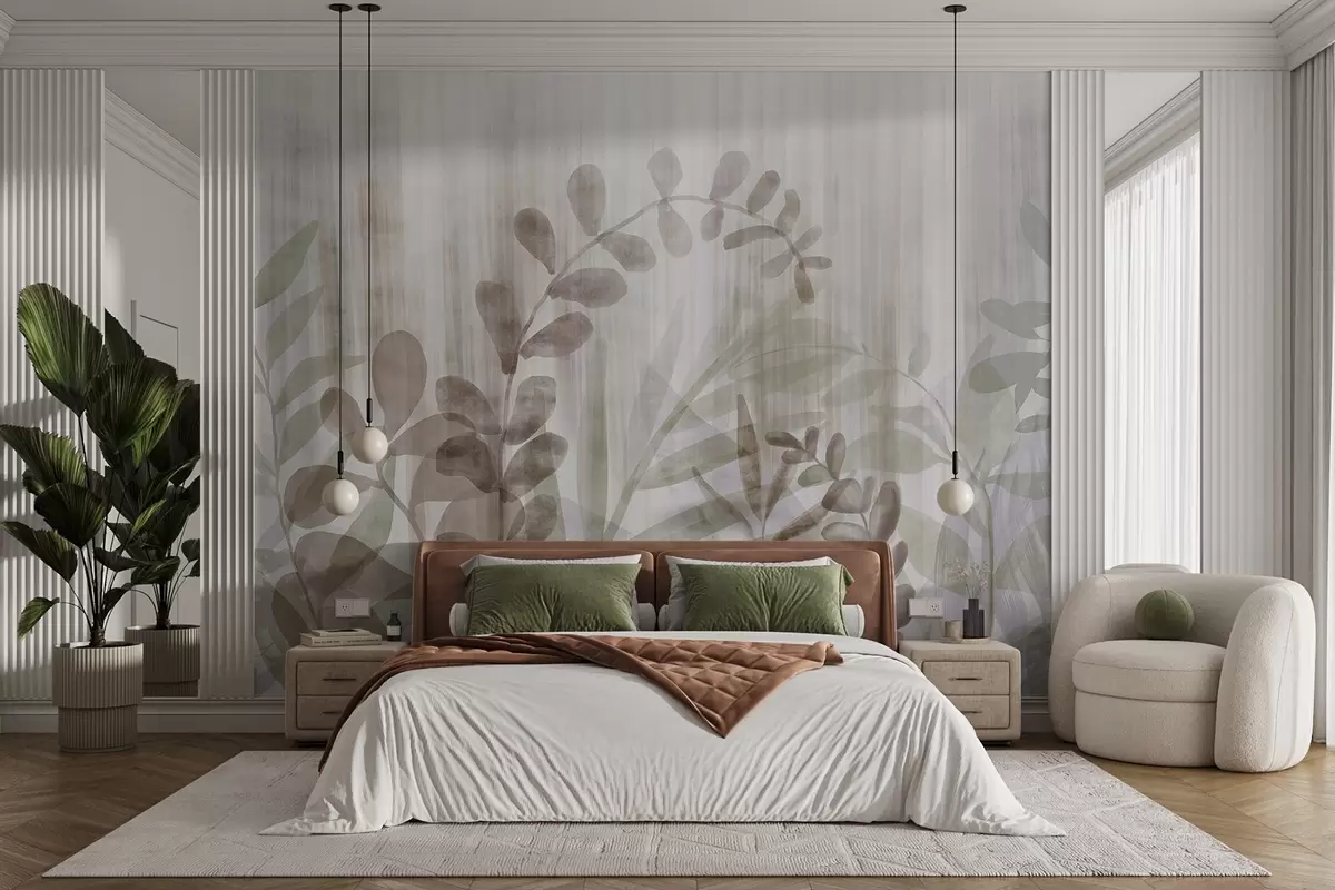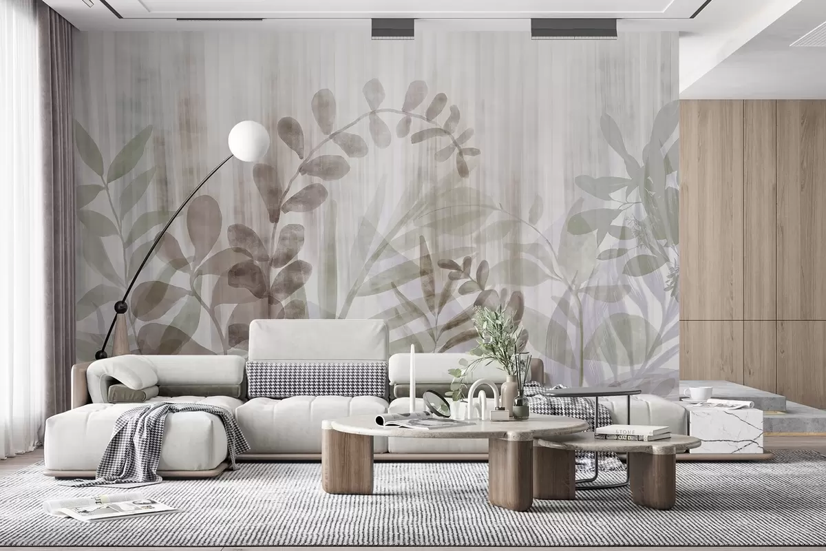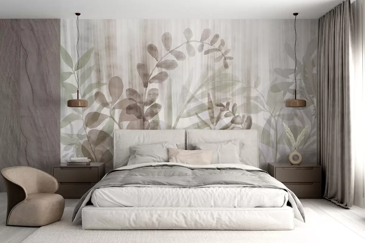 Stenske poslikave Akvarelno slikarstvo imitacija rastlin z večbarvnimi utišanimi listi, svetlo ozadje z navpičnimi črtami, botanična ilustracija Št. w09146v1