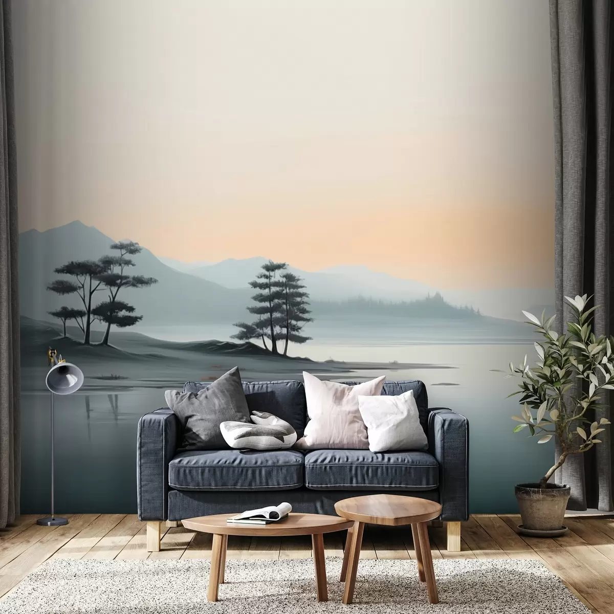 Stenske poslikave Minimalistična pokrajina z meglenimi gorami in jezerom Št. w09151