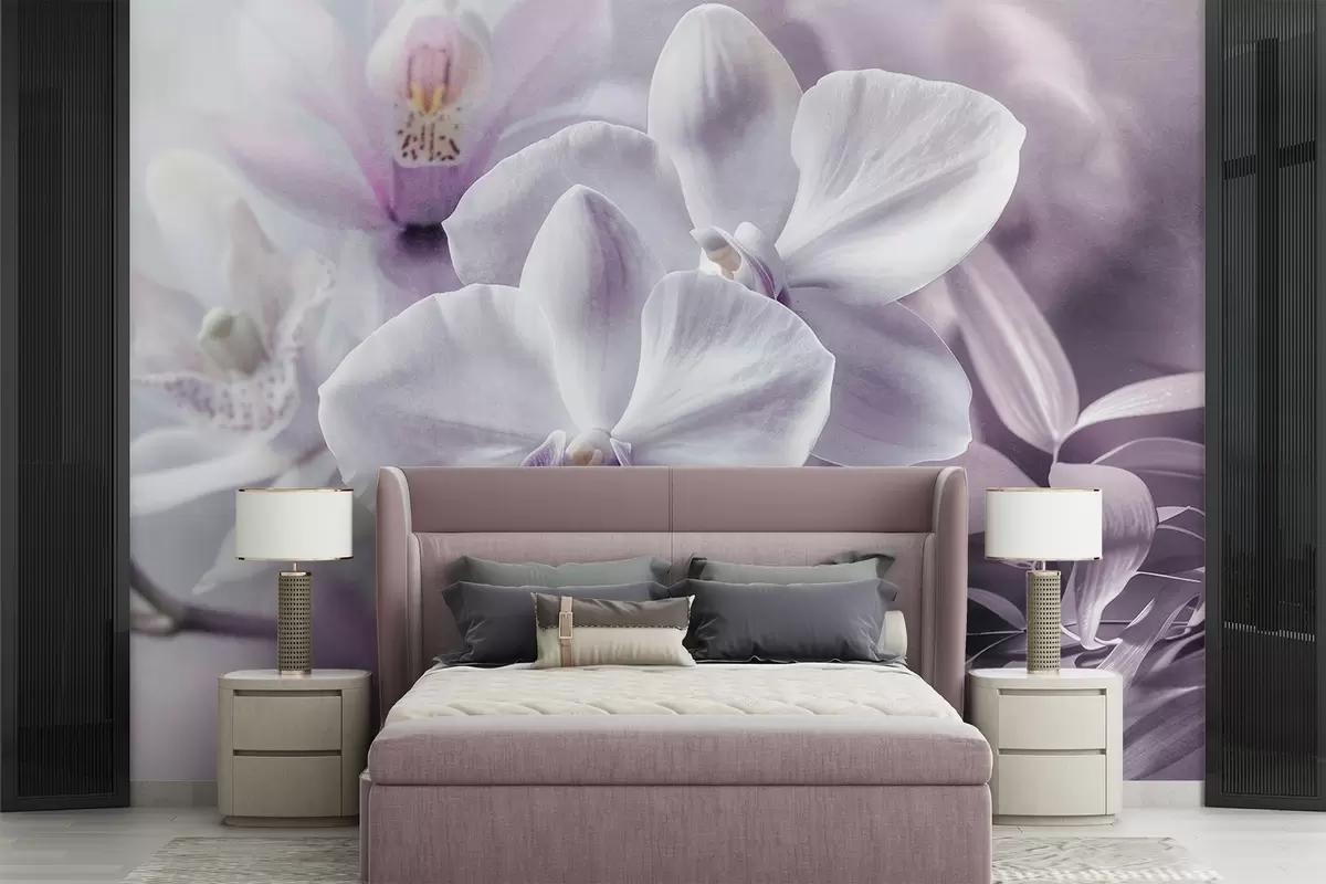 Stenske poslikave Beli in lila nežni cvetovi orhidej, mehka osvetlitev in zamegljeno teksturirano ozadje Št. w09155