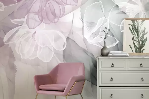 Stenske poslikave Cvetovi in listi s prozornimi cvetnimi listi v belih, rožnatih in zelenih odtenkih, mehki in nežni Št. w09158v1