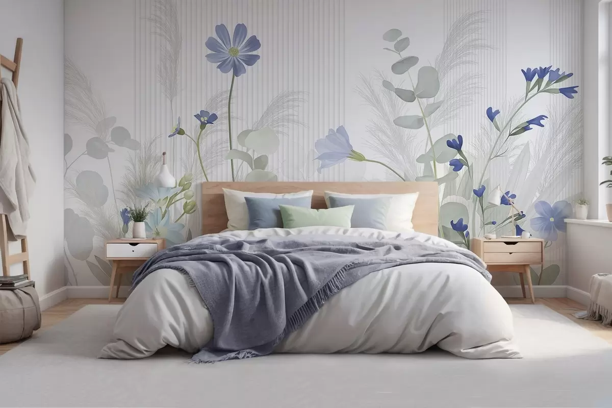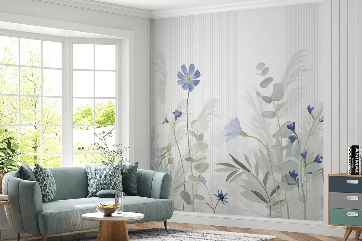 Stenske poslikave Cvetje v pastelnih barvah, svetlo zeleni listi, belo ozadje z navpičnimi črtami, elegantno in minimalistično Št. w09161v1