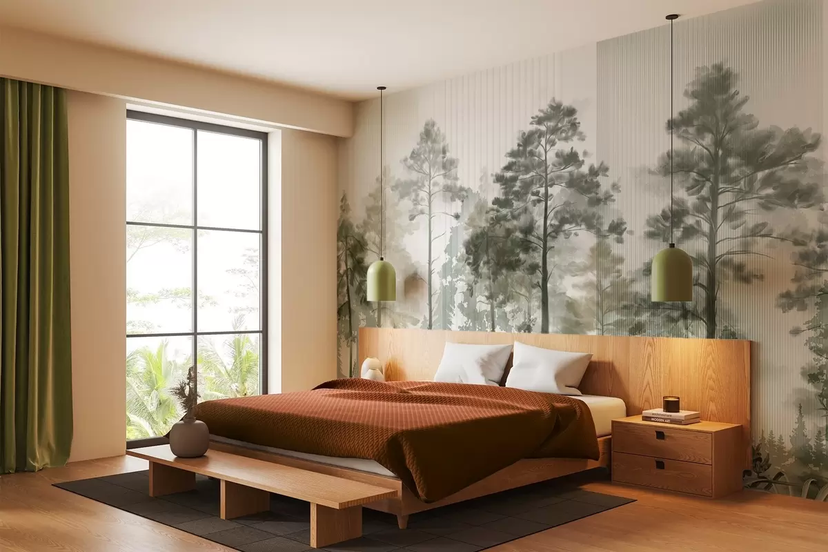 Stenske poslikave Gosti gozd z visokimi borovci, bujnim zelenim listjem, meglenim ozračjem in teksturo navpičnih črt Št. w09163