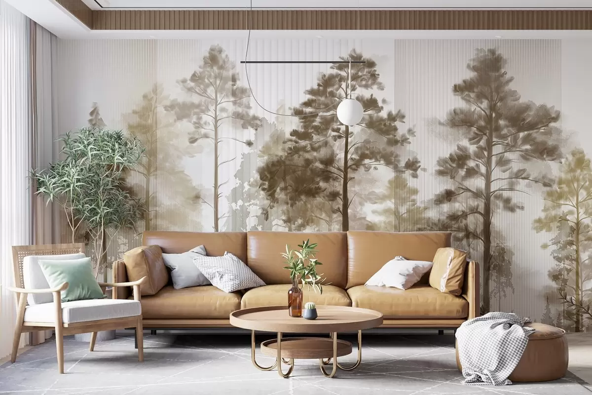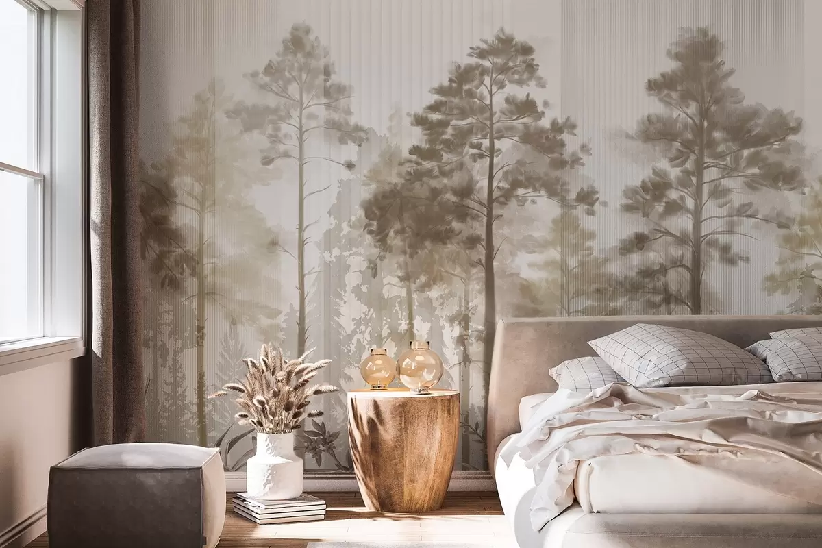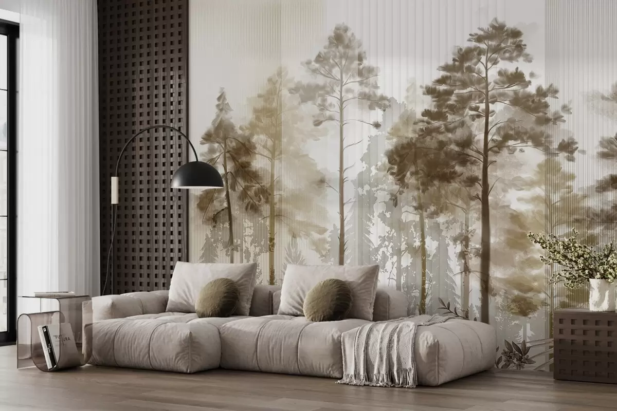 Stenske poslikave Gosti gozd z visokimi borovci, bujno bež listje, megleno ozračje z navpičnimi črtami Št. w09163v1