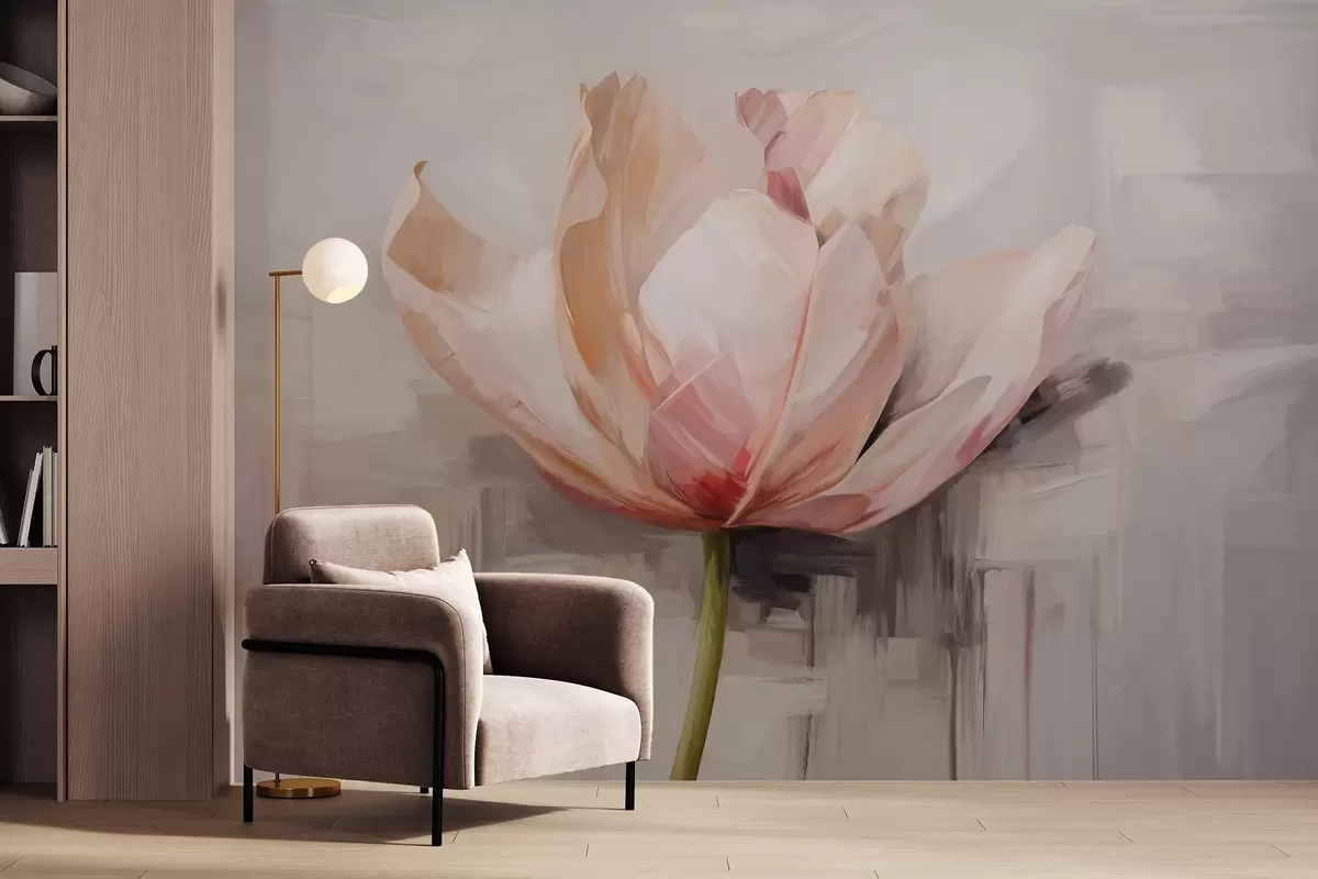 Stenske poslikave Roza tulipan, imitacija oljne slike z mehkimi potezami čopiča, abstraktno ozadje s pastelnimi odtenki sive in bež barve Št. w09187