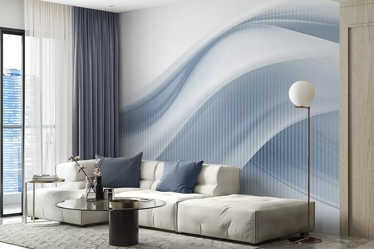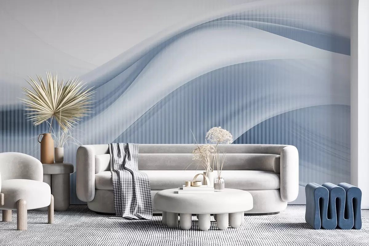 Stenske poslikave Abstraktni tisk s tekočimi črtami in subtilnimi navpičnimi črtami, ki ustvarjajo občutek gibanja in globine, modra paleta Št. w09189v1