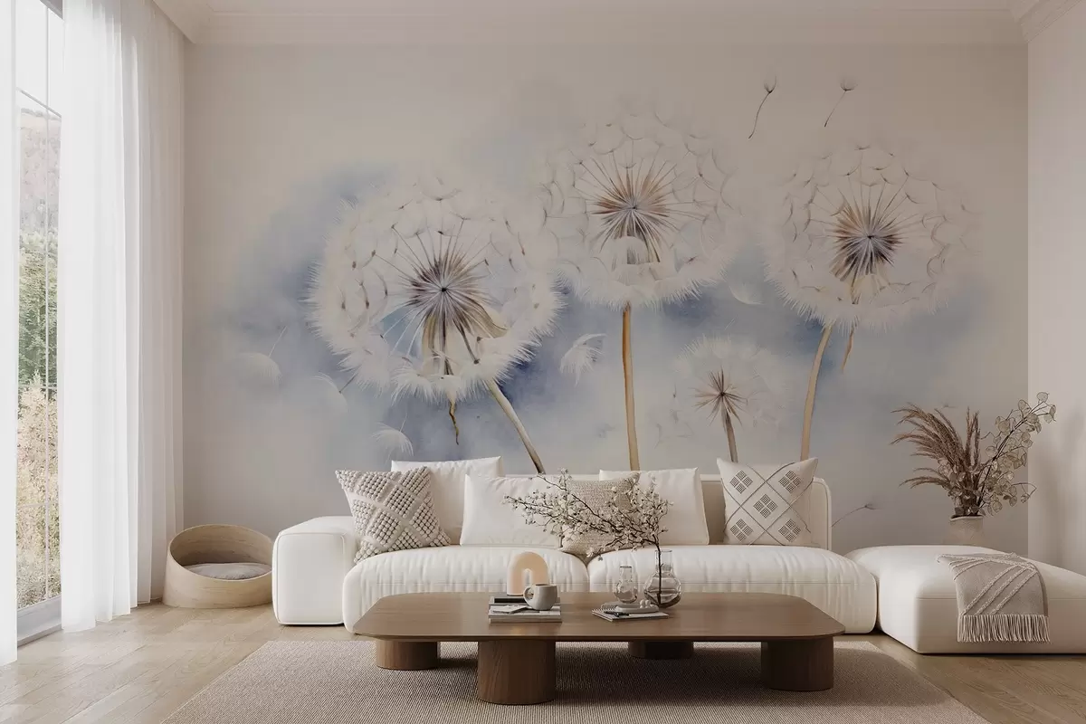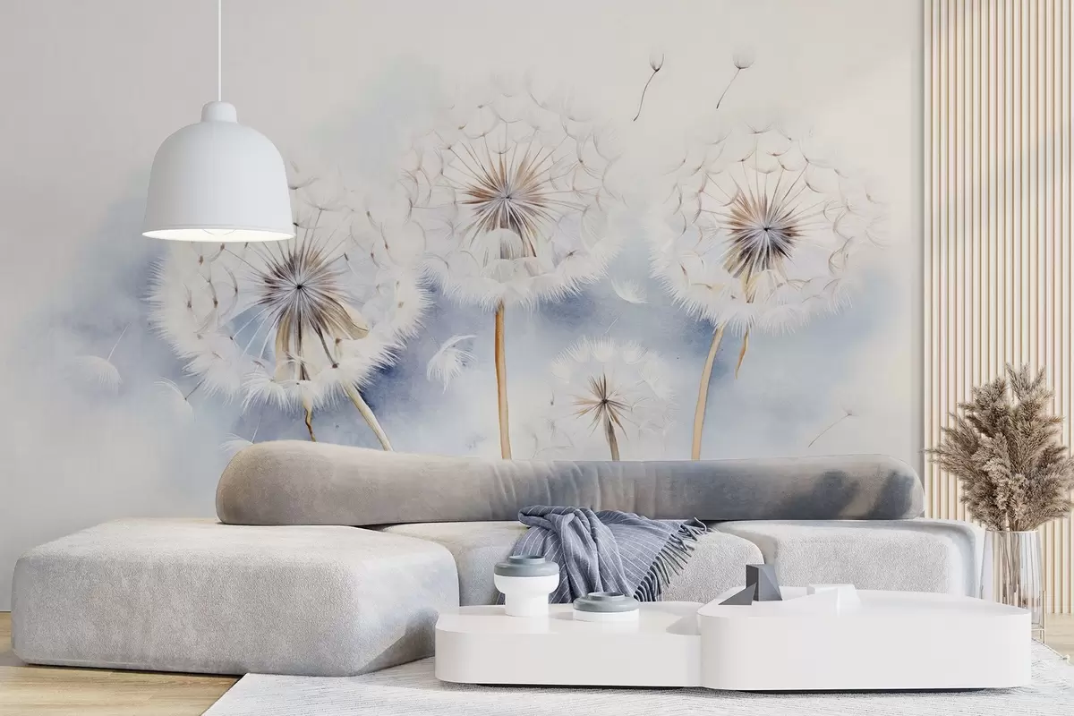 Stenske poslikave Teksturirani regrat s semeni, ki plavajo v zraku, svetlo modro in belo ozadje, mehak nežen slog risanja Št. w09190