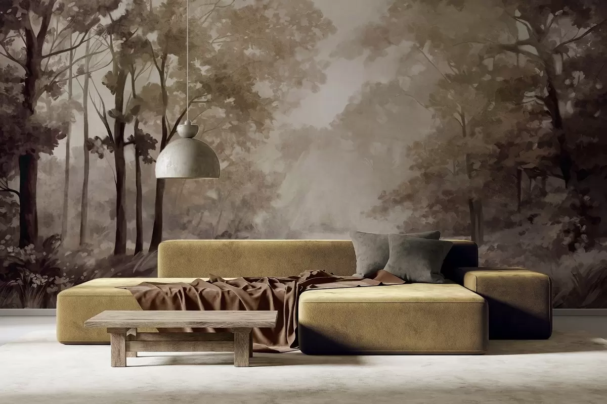Stenske poslikave Teksturirana gozdna pokrajina, drevesa z bež in rjavimi listi, pastelna barvna paleta Št. w09210