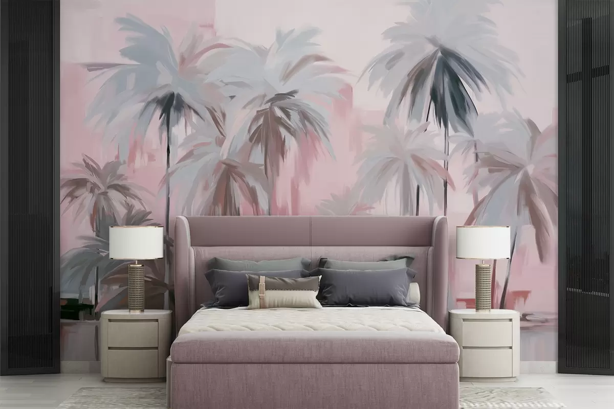 Stenske poslikave Abstraktne minimalistične pastelne tropske palme na ozadju v umirjenih rožnatih in sivih odtenkih Št. w09212v1