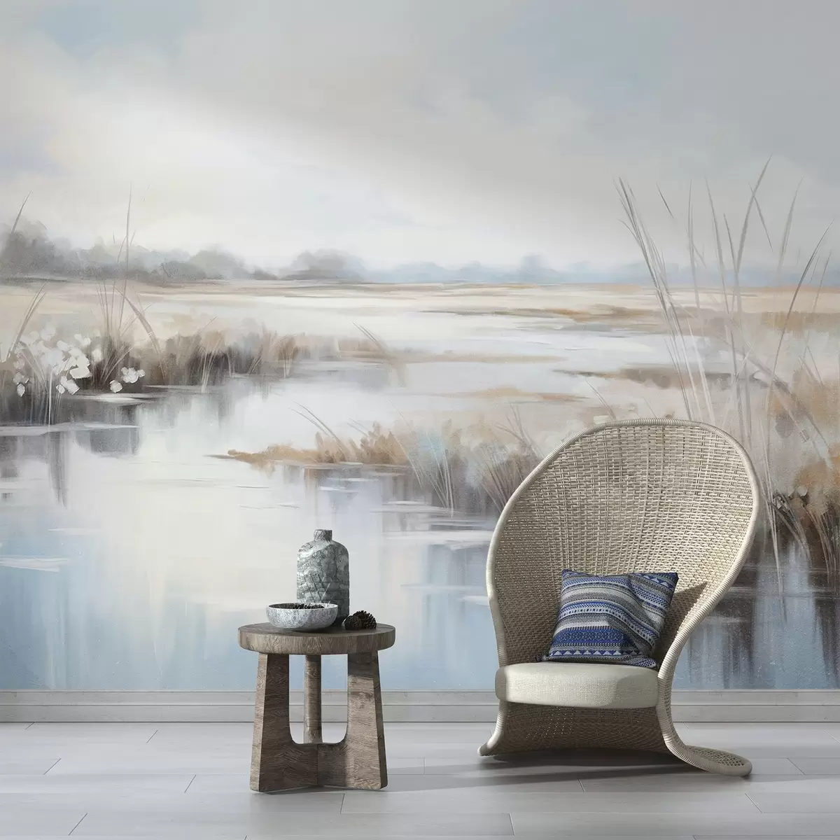 Stenske poslikave Teksturirana mirna pokrajina z visoko travo in mirno vodo, mehke pastelne barve, oddaljena drevesa na obzorju Št. w09213