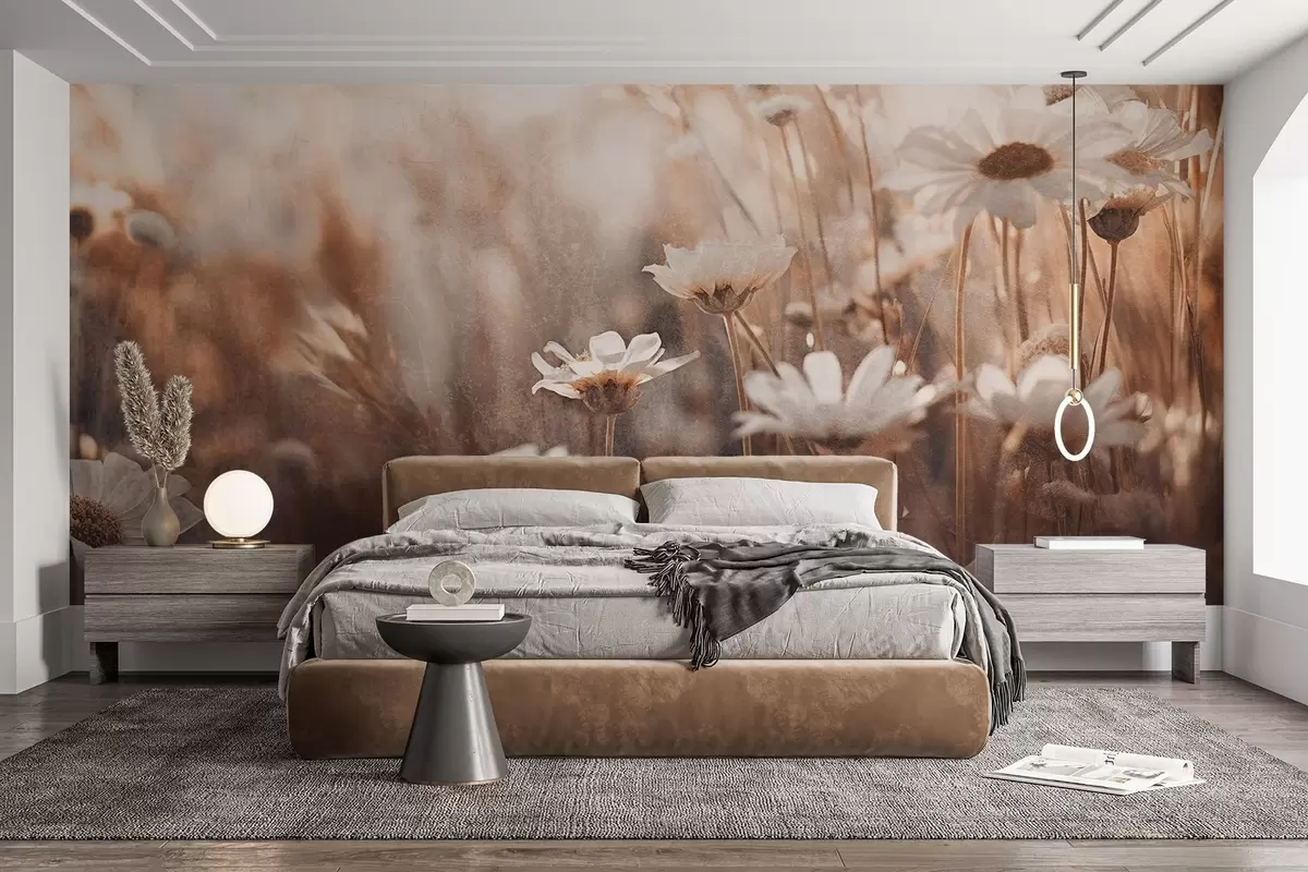 Stenske poslikave Teksturirano polje belih marjetic in divjih cvetov v topli barvni paleti z zamegljenim ozadjem Št. w09214